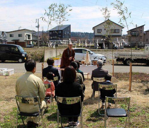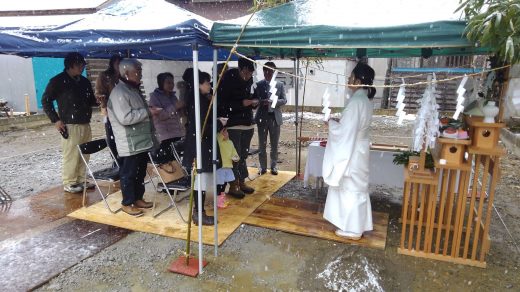 小雪で雪消えが早いので十日町市内でも2軒目の地鎮祭が執り行われました。 生憎の天候…