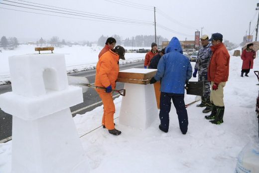会社の前に雪灯篭を30基とミニかまくらを作りました。雪の中、寒さもあって、なかなか…