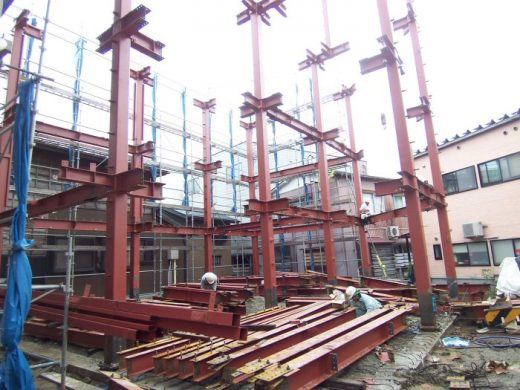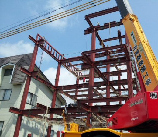 長岡市表町で重量鉄骨造3階建て住宅の鉄骨が建ちました。