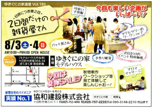十日町市新座364-34「ゆきぐにの家」モデルハウスにて8月3日4日「2日間だけの…