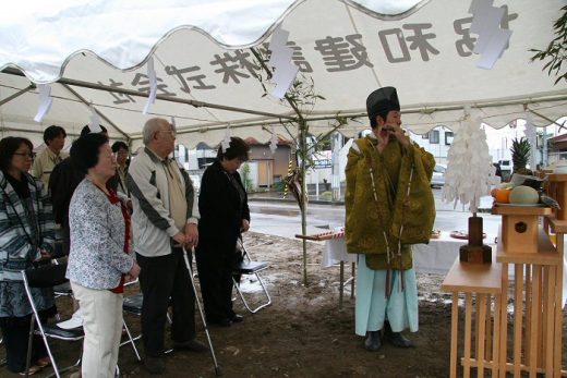 長岡市南町3丁目で地鎮祭が執り行われました。今回の神主さまはご自分で笛を吹かれ、厳…